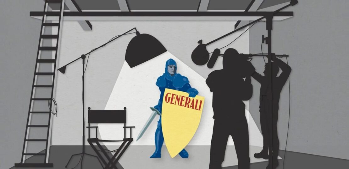 Un possente guerriero medievale, simbolo della protezione assicurativa, è posto a difesa dei beni più importanti (la vita, la casa, il frutto del proprio lavoro), munito di spada e scudo sul quale sono riportate in magiaro le ragioni sociali di Generali e della propria sede di Budapest.