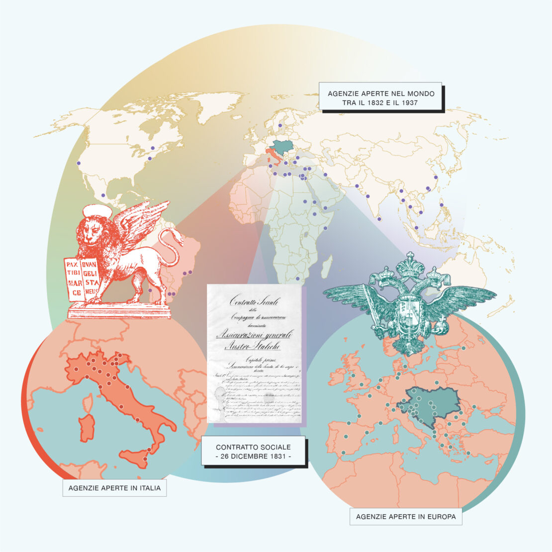 Tale denominazione, dimostrava l’aspirazione di Generali a unire interessi, luoghi e persone, rivolgendosi sia all’Impero asburgico che agli Stati italiani. A riprova di ciò, l’impresa aveva costruito tutta la struttura organizzativa, sociale e finanziaria su due pilastri portanti, la Direzione centrale di Trieste – competente per la Monarchia e l’estero – e la Direzione di Venezia – con responsabilità sulla penisola italiana, sedi che nel 1831 appartenevano dal punto di vista politico a realtà amministrative diverse pur all’interno dell’Impero: Trieste alla Monarchia asburgica, Venezia al Lombardo-Veneto.