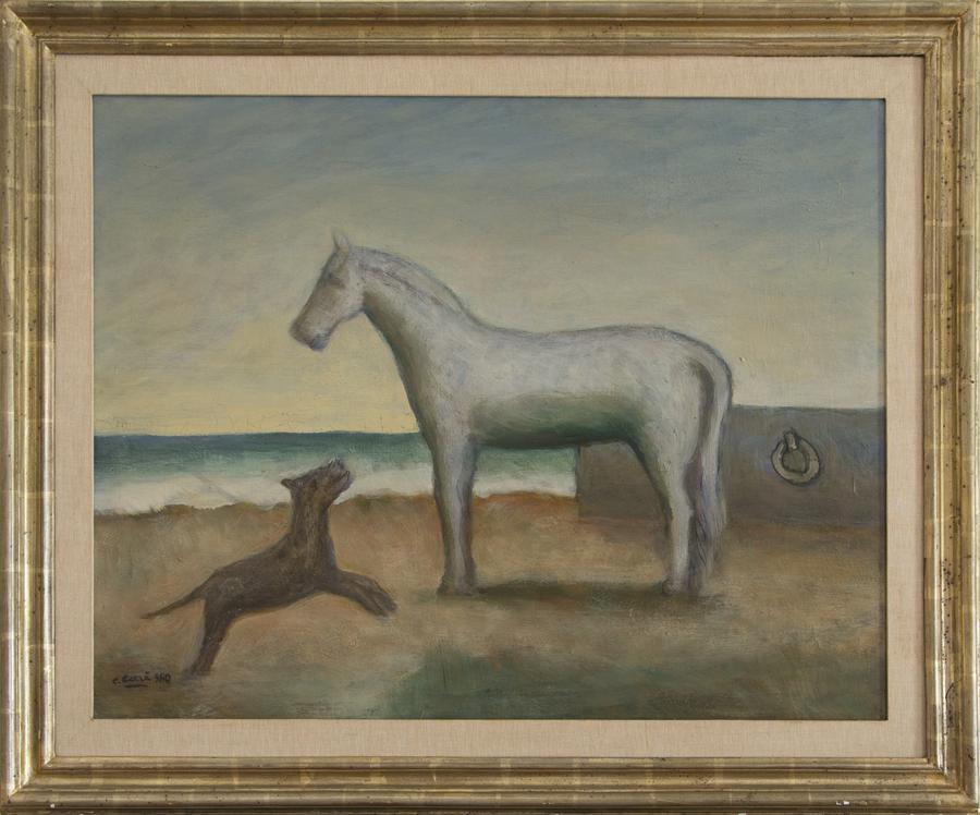 Il cavallo e il cagnolino rimangono bloccati in una poetica di plastica purezza, che rimanda alla purezza d’animo dell’infanzia, a guisa di giocattoli maneggiati da un fanciullo. Lo spazio è costruito in maniera semplicistica attraverso quattro piani costituiti dalla spiaggia, il mare, il cielo e il muretto.