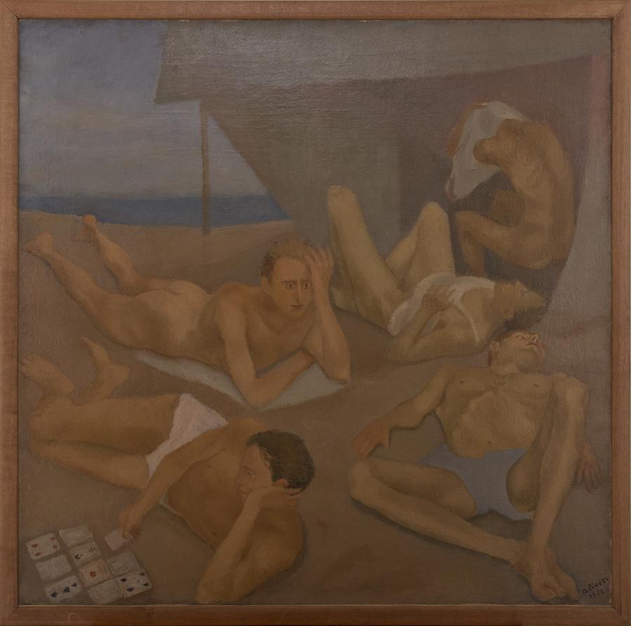 Alberto Ziveri fu uno dei rappresentanti della cosiddetta “Scuola Romana”, autore di paesaggi urbani e di scene di realismo narrativo come questo gruppo di giovani atleti-bagnanti colti nell’attimo del riposo sui galleggianti del Tevere.