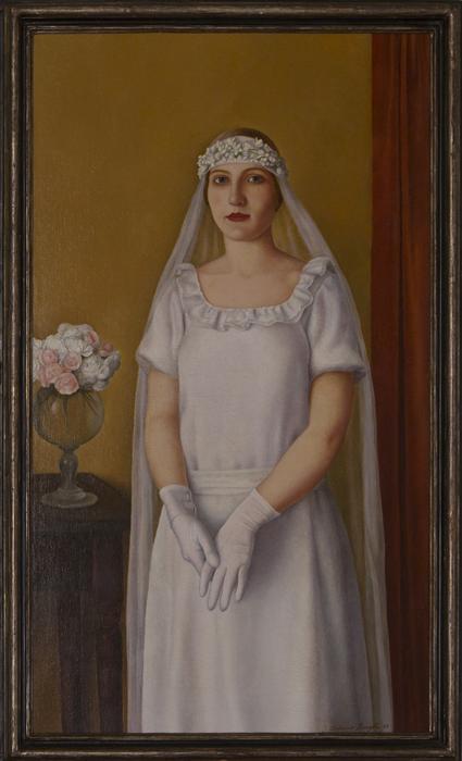 Nei suoi quadri, come nella Sposa, uno dei capolavori dell’artista, una linea continua ritaglia senza spigoli le forme levigate, dando vita alle ampie campiture di colore: la fissità della posa, l’inespressività, lo splendore del colore, fanno pensare a una figura messa sotto una campana di vetro.