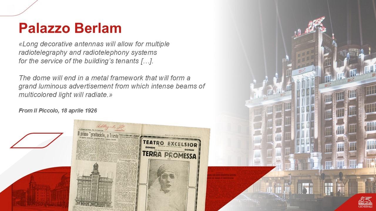 On June 6, from 6:30 PM to 7:45 PM, a talk will be held in the auditorium of Palazzo Berlam, focusing on the iconic Generali buildings along Trieste’s seafront: Palazzi Carciotti, Geiringer, and Berlam.