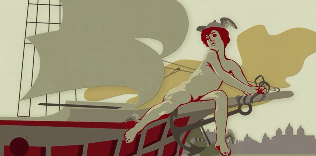 The classical-style figure of Mercury, the god of commerce, stands out in the poster against a backdrop depicting the lagoon of Venice and the clocktower of St Mark’s Square, symbols of age-old entrepreneurship and solid economic systems.