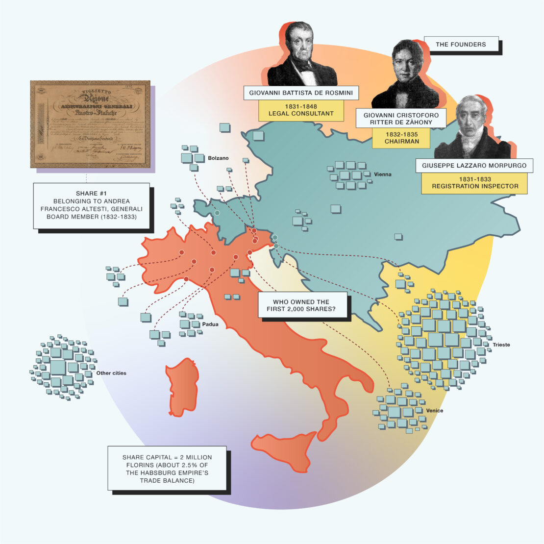 Directories, share registers and transfer registers enable us to reconstruct the composition and geography of the shareholders. Generali’s first shareholders were industrious characters: insurers, owners of trading houses or members of traditional merchant families. Besides Trieste, the cities featuring most on the lists were Venice, Padua, Verona and Ferrara, Vienna and Ljubljana. They were followed by Milan, Genoa, Piacenza, Florence, Naples, Reggio, Catania and Messina; Kronberg, Graz, Bolzano, Gorizia, Pordenone, Fiume (now Rijeka), Karlovac, Szeged, Pest and Prague, centres roughly corresponding to the first agencies. Among those elected to the most important company positions, were leading figures at European level (such as Ritter de Záhony, Giovanni Battista de Rosmini, Pasquale Revoltella and Morpurgo himself) in contact with the most powerful banking and financial circuits of the time.