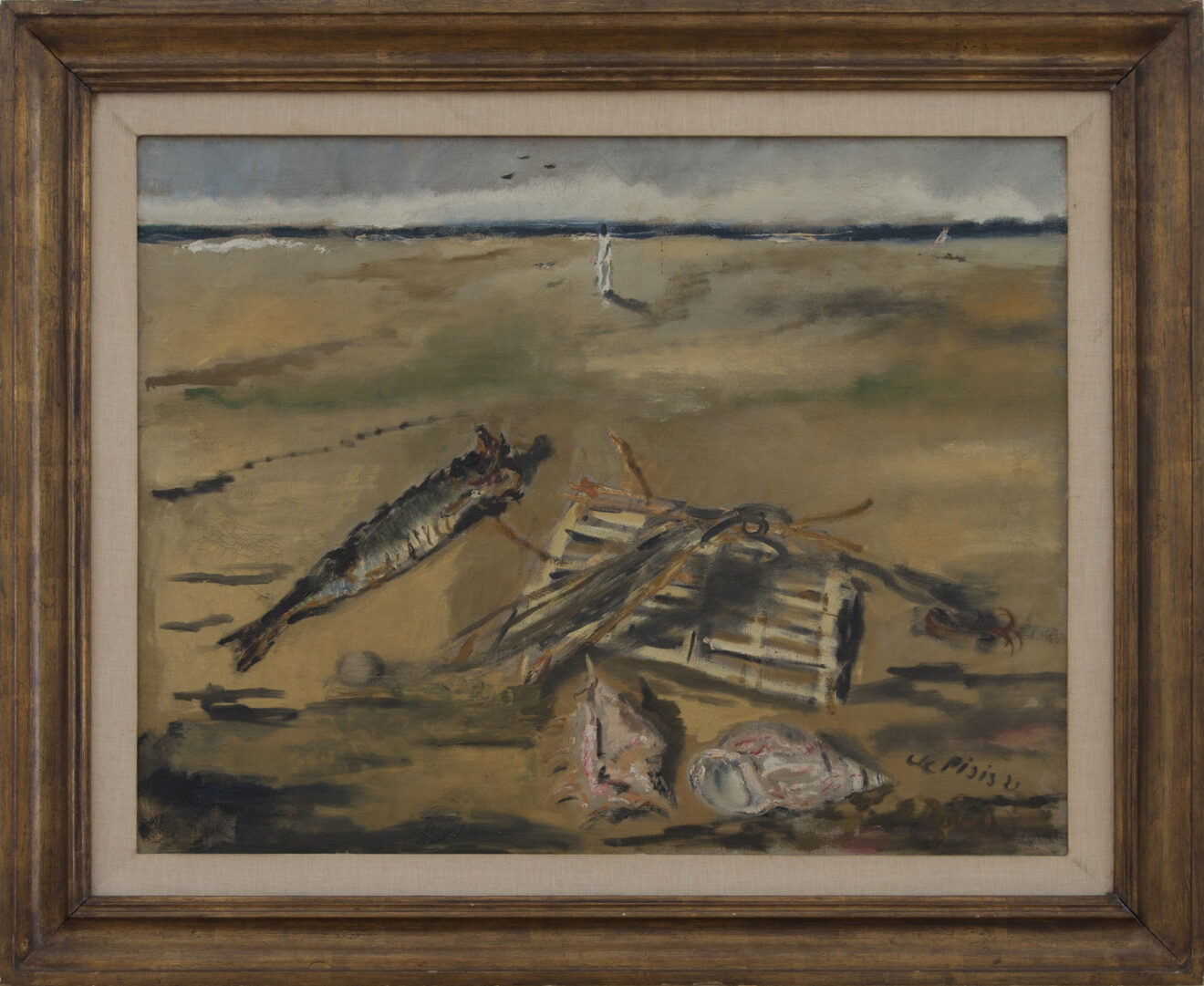 The shells, the salted fish and the tall figure at the water’s edge are common features in De Pisis’ still lifes, often set with the sea as a backdrop. They are rooted in the mirabilia [“wonders”] gathered by the artist in his youth, such as shells or wild herbs, and in the metaphysical painting of Carrà and De Chirico, from whom he reproduces subjects and spatial and temporal settings. Suspended in time, or rather trapped in the present — a present of decadence and solitude, of neglect, of impending putrefaction in which these participants are consumed and dissolved for eternity. These participants are reduced to apparitions. The passage of these apparitions recalls a painful existential sensation: the extremes of carpe diem and a melancholic awareness of destiny are recurring themes in De Pisis’ poetry, hungry and despairing.