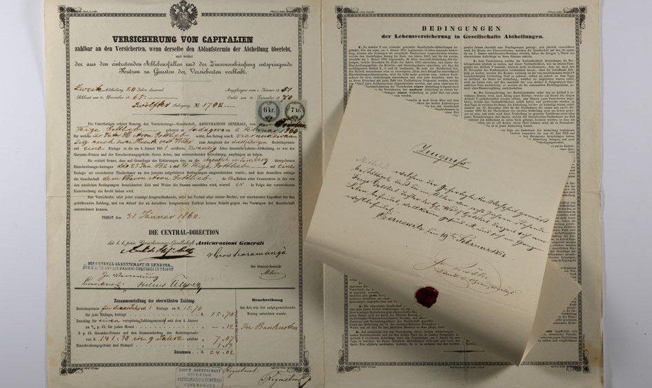 The Central Secretariat‘s volumes contain the correspondence between the Trieste Management and the various agencies in the territories of the Empire, attesting once more how German, in this particular layout, was the lingua franca in use from Austria-Hungary to Galicia, Bucovina and Germany. The offices in Trieste, Vienna, Hamburg, Leipzig, Graz, Budapest, Prague, Bratislava, Krakow, Lviv, Czernowitz, Zagreb and Belgrade, to cite the most important, are thus affected and united with each other. Documentation from the agencies of the Empire is also present in the Personnel Service fonds, together with the individual positions of individual employees (we recall those of two illustrious writers: Franz Kafka and Leopold Perutz), as well as in the remarkable collection of policies that the Historical Archive conserves and which illustrates some aspects of the activities of the life, transportation and fire insurance branches.