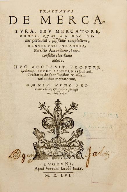 One of these stands out: Tractatus De mercatura, seu mercatore, by Benvenuto Stracca, published in Venice in 1553, represents the first document dedicated to legal matters surrounding maritime insurance.