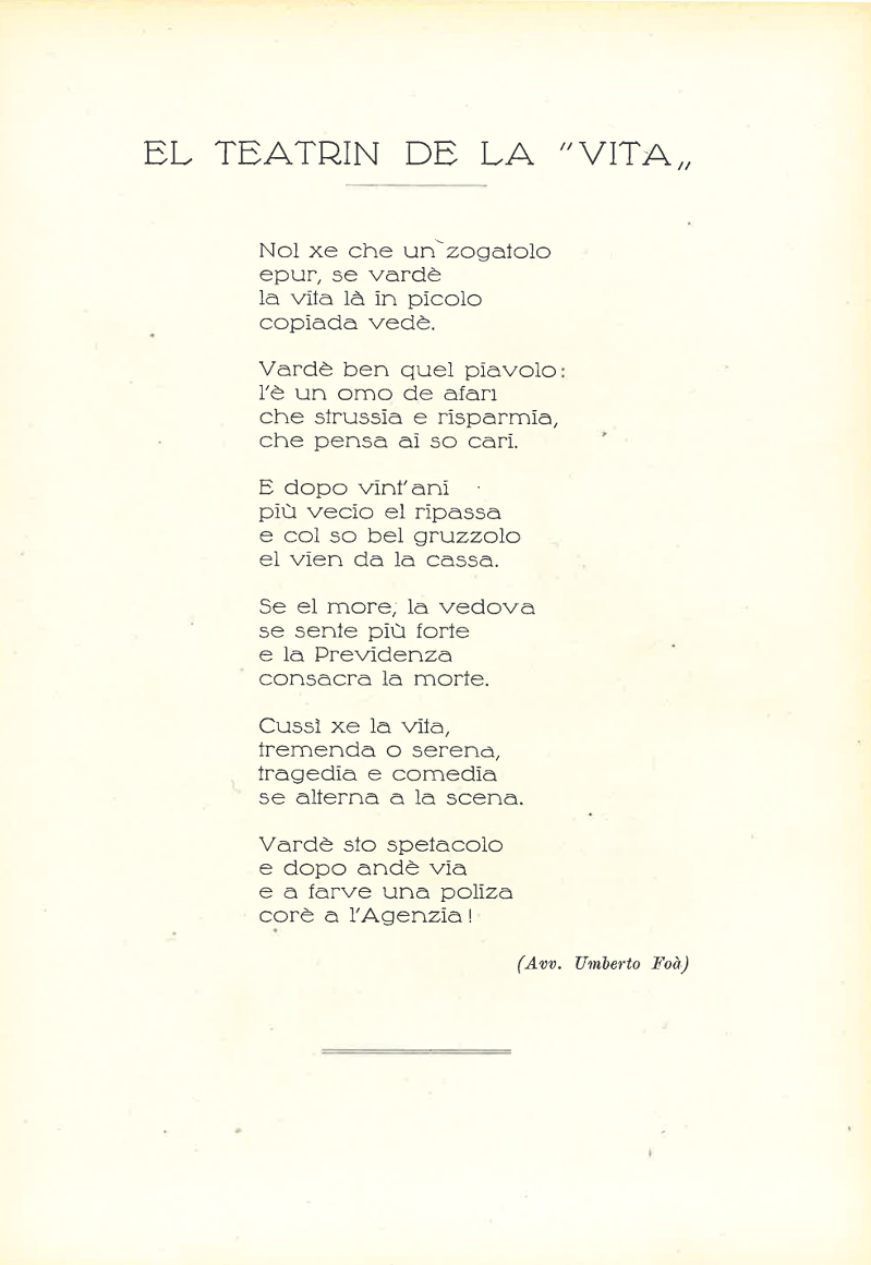 Unfortunately, nothing described above has been preserved… and so? As Generali employee and Venetian poet Umberto Foà urged in a little dialect poem: “Vardè sto spetacolo e dopo andè via e a farve una poliza corè a l’Agenzia! [Look at this display and then be off to the Agency to take out a policy!]”.