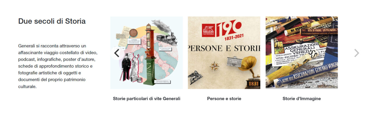 This new section is a fascinating journey into Generali’s almost two-century-long past through the mediums of video, podcasts, infographics, posters, historical insets and artistic photographs of objects and documents from Generali’s cultural heritage. These combine to tell stories that demonstrate the values of innovation, the ability to react to challenges, connection, internationality and corporate responsibility, which have always been part of the Generali Group’s DNA.