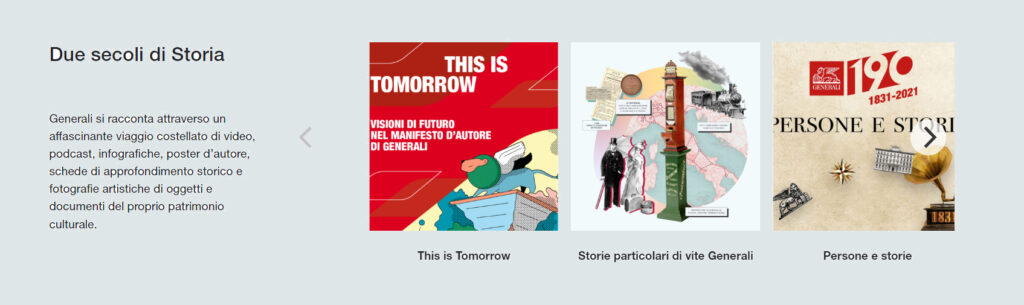 The stories take various forms: from the audio lectures by the radio presenter Matteo Caccia, which brought to life the Generali Life Stories: Extraordinary Tales of Ordinary Lives project, to the videos of Generali 190: People and Stories and the historical insets drawn from the archives, to the summary infographics with their eye-catching style.
