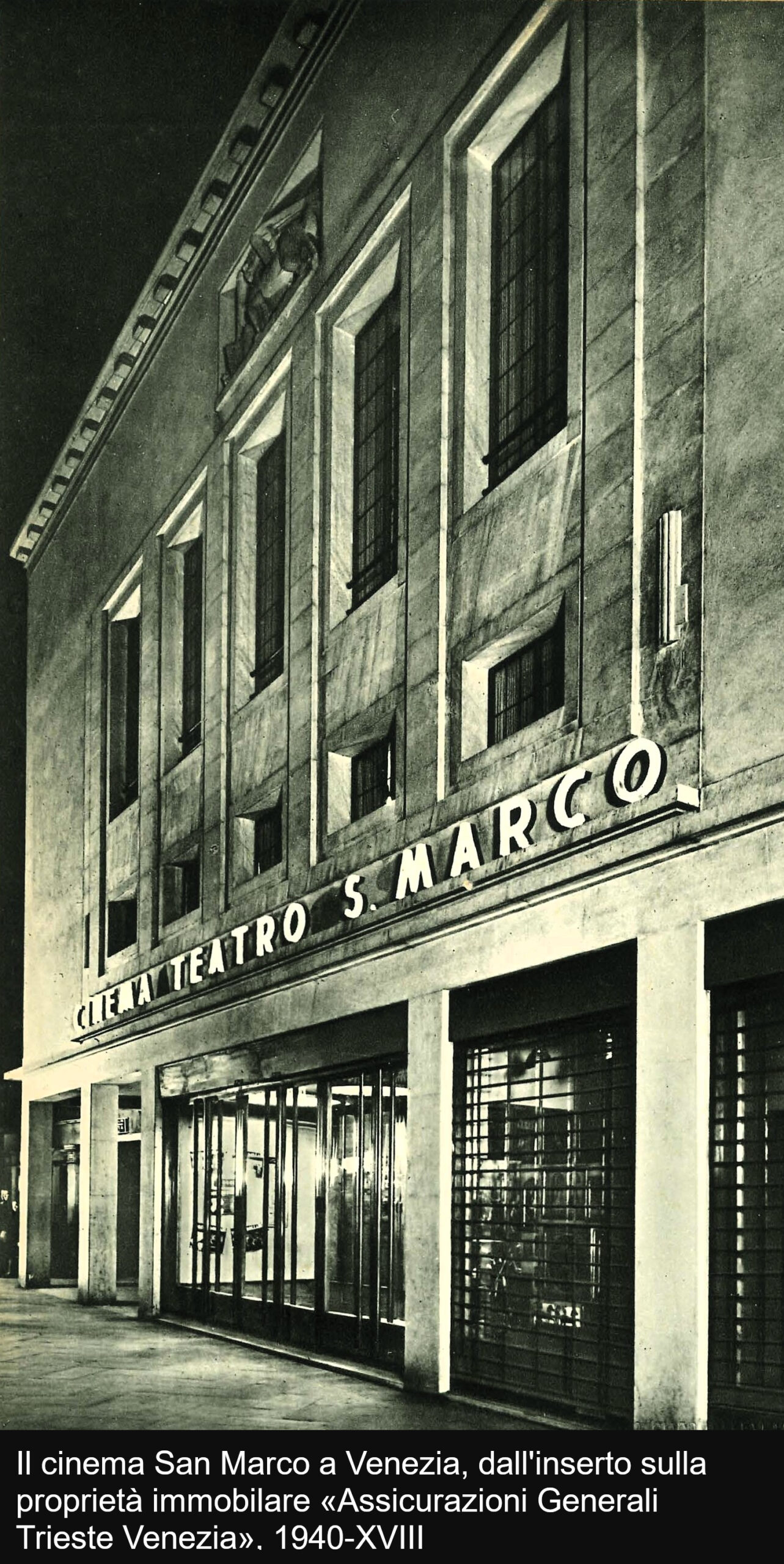 Anche la documentazione tecnica prodotta da rami e servizi, quali il Vita e l’Immobiliare, offre uno spunto d’indagine interessante. Si trova notizia, per esempio, che alla fine degli anni sessanta del secolo scorso venne prodotto un contratto collettivo di assicurazione vita per la 20th Century Fox o che nel corso del tempo Generali ha posseduto o assicurato numerosi cinema in Italia e all’estero ricordati, in alcuni casi, per l’eleganza e la modernità delle attrezzature e per gli scatti d’epoca conservati. Due nomi su tutti: il cinema san Marco a Venezia, in salizada san Moisè nei pressi di piazza San Marco, inaugurato il 2 febbraio 1940, e il cinema Palladium a Varsavia. Quest’ultimo, inaugurato il 21 ottobre 1937, fu anche coinvolto nelle vicende dell’insurrezione della città contro i tedeschi nel 1944.