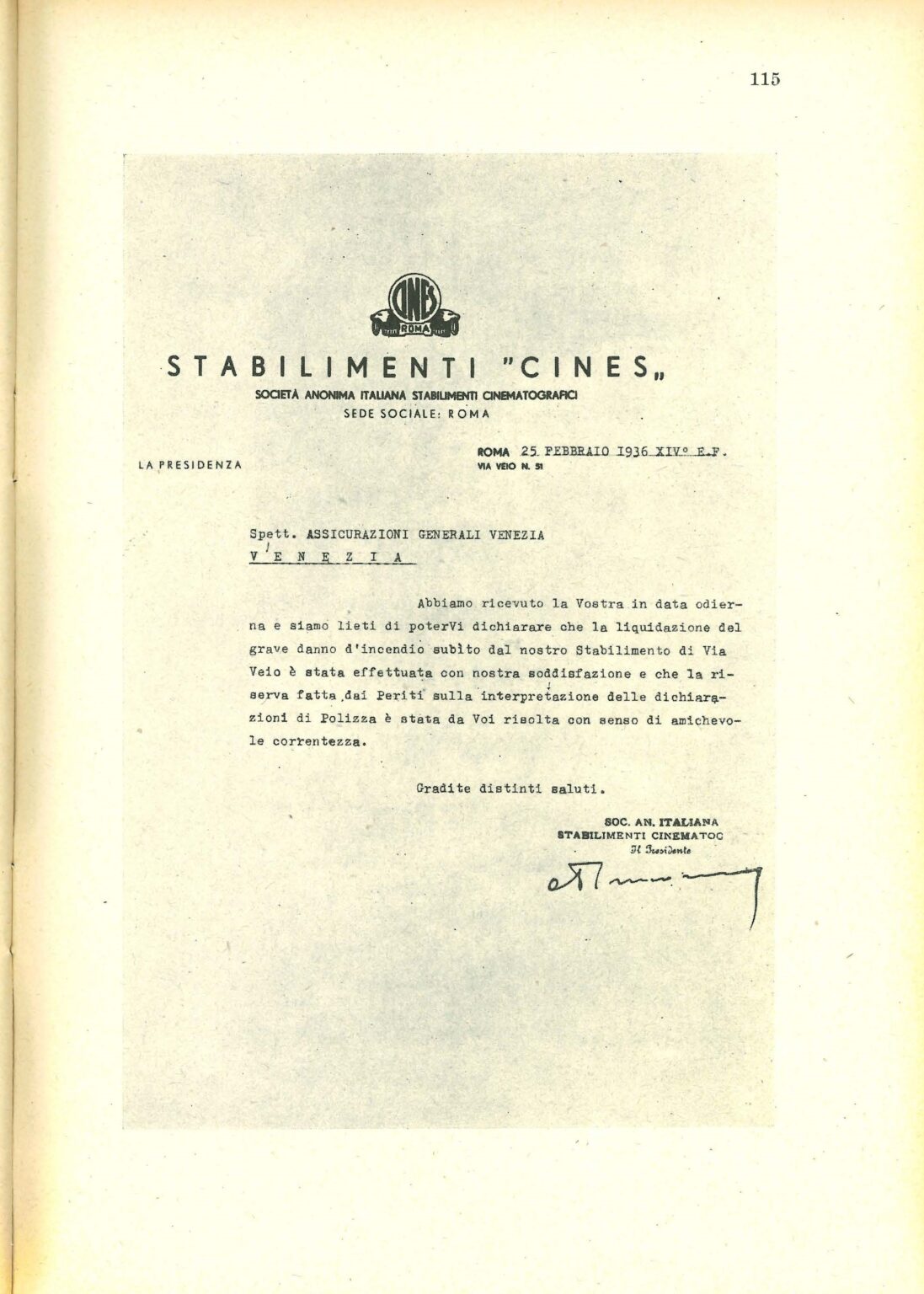 Negli anni trenta si attestano le prime testimonianze di assistenza assicurativa offerta al settore da parte della Compagnia: la rivista aziendale il «Bollettino» del marzo 1936 pubblica le foto del rovinoso incendio che ha colpito gli stabilimenti della Cines a Roma e la relativa lettera di ringraziamento da parte dell’azienda stessa, una delle prime e storiche case cinematografiche italiane.