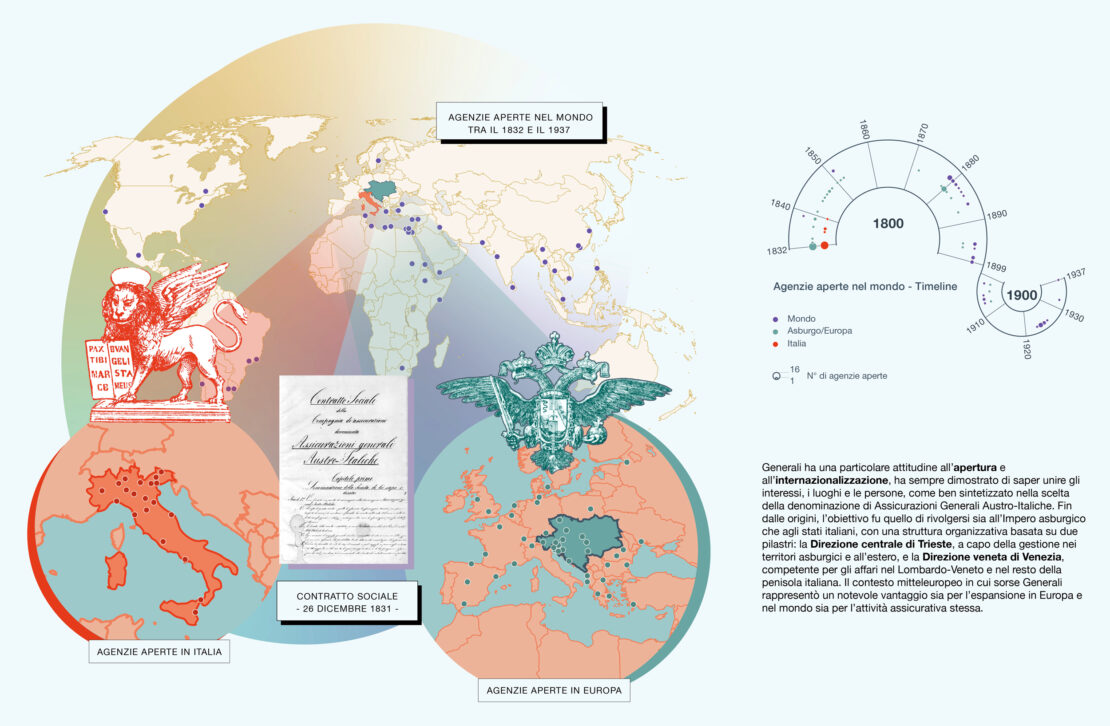 Ma Generali è stata sempre prima di qualsiasi altra cosa una compagnia con una radicata vocazione internazionale, che l’ha vista in grado di rispondere a esigenze e necessità di paesi diversi fin dalla firma del contratto sociale di fondazione: un azionariato distribuito tra penisola italiana e Impero austriaco, un’anima societaria in un doppio corpo, d’aquila e di leone (come rispecchiato nei simboli adottati da Generali per comunicare visivamente la propria identità), che trovò in una struttura organizzativa bicefala con due Direzioni (Trieste e Venezia) il proprio naturale modus operandi, la capacità di essere protagonista di importanti progetti, di accogliere le nuove sfide e di anticipare le tendenze future, mantenendo sempre al centro le persone e i loro bisogni, le loro aspirazioni, in un’ottica di apertura e dimostrando una resilienza costante.